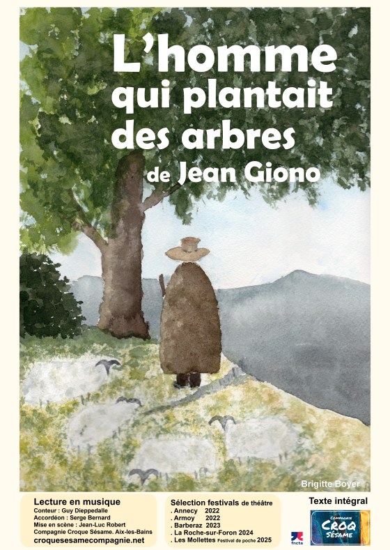 Je considère Giono comme un artisan d’Amour et de Paix qui sculpte ses phrases et peint ses mots comme un poète. Il y a une dizaine d’années, j’ai découvert ce texte, qui m’était inconnu : « L’homme qui plantait des arbres ». Brillamment interprété par Yannick Boitrelle. Ce récit m’a touché. J’avais envie de le partager avec le public. Il m’a fallu une dizaine d’années pour me décider à marcher, avec Giono, sur les traces de ce berger planteur d’arbres. Dans une région aride, désertique, quasiment inconnue des touristes. Sous la brutalité insupportable du vent…
