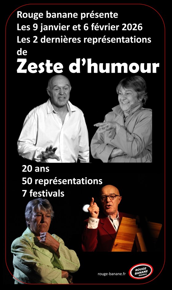 Un beau spectacle de Rouge banane qui touche à sa fin : Zeste d’humour. L’histoire d’une femme qui raconte ses rencontres au fil de ses amants. Quelques textes signés Jean-Michel Ribes, Roland Dubillard, Karl Valentin, Guy Dieppedalle…
