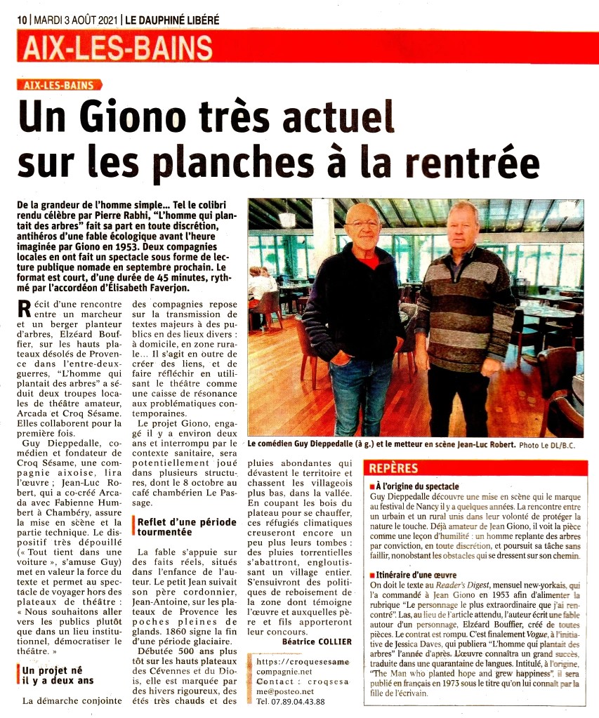 Je considère Giono comme un artisan de l’écriture qui sculpte ses phrases et peint ses mots comme un poète. Il y a une dizaine d’années, j’ai découvert ce texte humaniste, qui m’était inconnu : « L’homme qui plantait des arbres ». Brillamment interprété par Yannick Boitrelle. Ce récit m’a touché. J’avais envie de le partager avec le public. Il m’a fallu une dizaine d’années pour me décider à marcher, avec Giono, sur les traces de ce berger planteur d’arbres. Dans une région désertique quasiment inconnue des touristes. Sous la brutalité insupportable du vent.